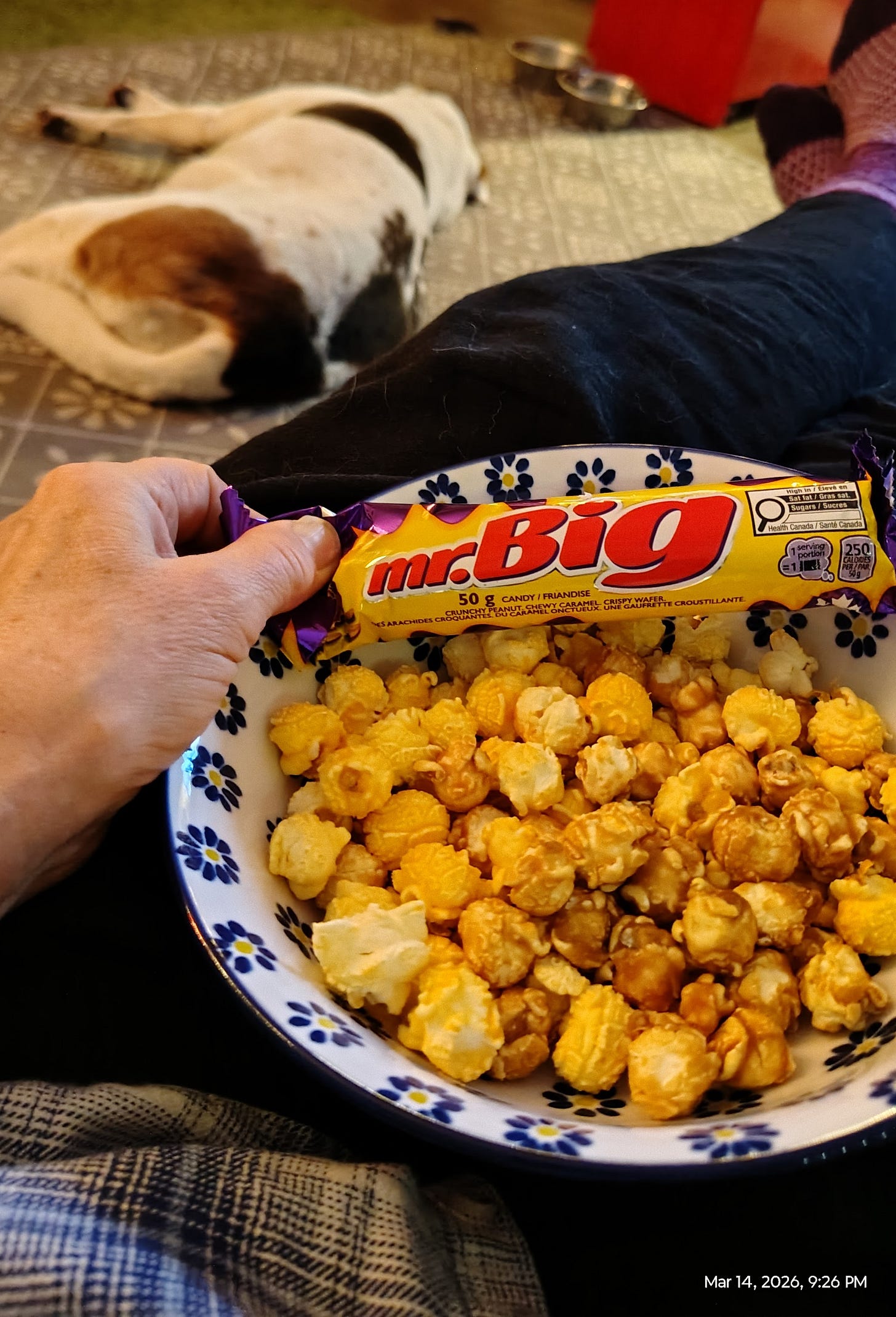 I got home about 9:00, took my dog Ruby out, and then started to open my gifts from Mary. When I caught sight of the caramel cheese popcorn and chocolate, though, I stopped and collapsed on the couch.