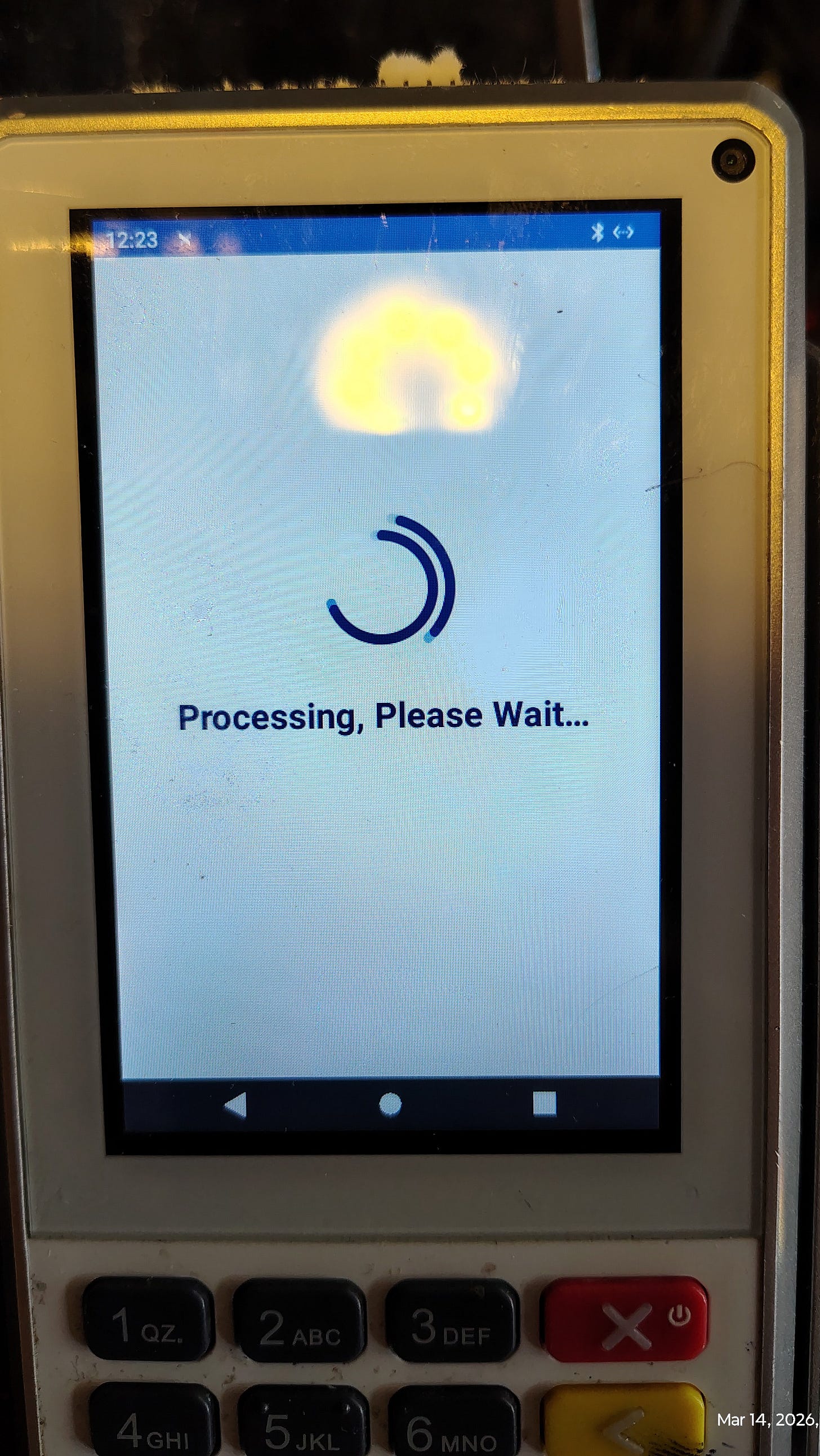 The credit card reader seemed to be malfunctioning. The transactions from the night before were still in the system; they hadn’t been batched out and I couldn’t get the machine to work. (Settling the batch sends the previous day’s records to the bank, so you can begin the day shift with an empty batch; your first transaction should be #1.)